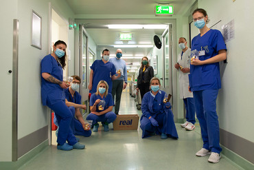 Alle freuten sich über diese Gabe von real, den Bürgerinnen und Bürgern aus Göttingen und der Region sowie des Vorstandes der UMG. „Das ist Klasse! Eine tolle Geste““, sagte Jannis Leifheit, Pfleger aus der Orthopädie, der zurzeit auf der Infektionsstation aushilft. In vielen Bereichen arbeiten gemischte Teams. „Wir lernen Neues kennen und voneinander“, sagt Pflegedirektorin Dokken. „Ich würde mir wünschen, dass dieser Spirit auch über die Coronazeit hinaus anhält“, sagt sie.