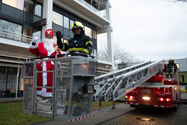 (umg) Alle Jahre wieder: Er kommt! Dieses Mal sogar im Doppelpack: Der Nikolaus besuchte die Klinik für Kinder- und Jugendmedizin der Universitätsmedizin Göttingen (UMG). Brandmeister Stefan Prause von der Feuerwache Klinikum der Berufsfeuerwehr Göttingen unterstützte den Nikolaus (alias: Daniel Rühmann vom Rotaract Club Göttingen) mit der großen Feuerwehr-Leiter, genauer: einem Hubrettungsfahrzeug mit Drehleiter, an der Südfassade der Kinderklinik des Universitätsklinikums. So konnten auch die Kinder, die auf den Stationen bleiben mussten, den Nikolaus aus ihren Zimmern heraus sehen.