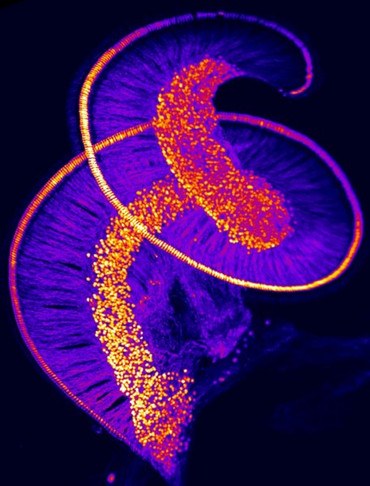 BILDUNERSCHRIFT: "Wendeltreppe" der Sinnes- und Nervenzellen des Innenohres, hier dargestellt durch Fluoreszenzmikroskopie nach Anfärben des Proteins Calbindin. Quelle: Carlos Duque Afonso & Dr. Christian Vogl.IAN/UMG